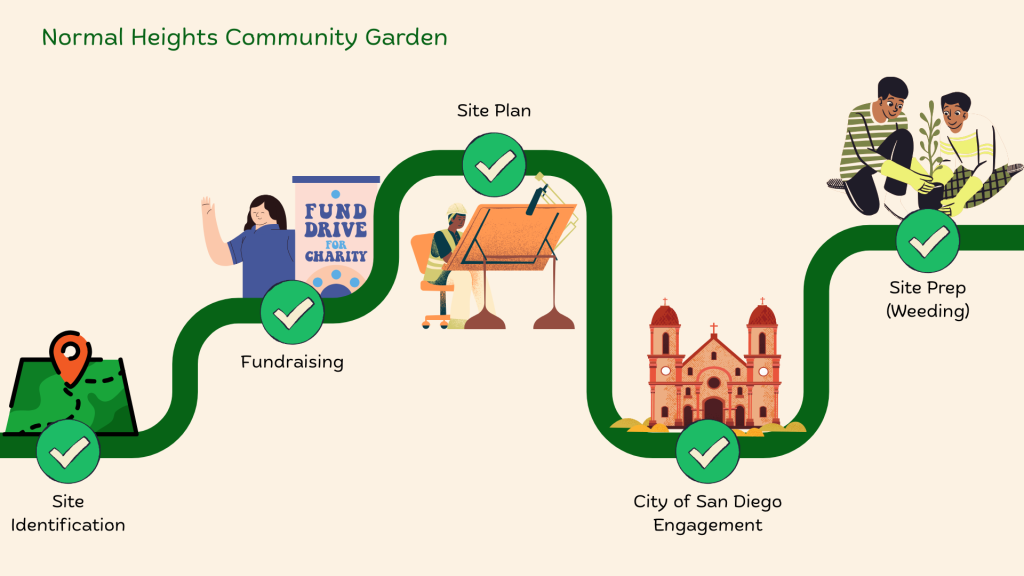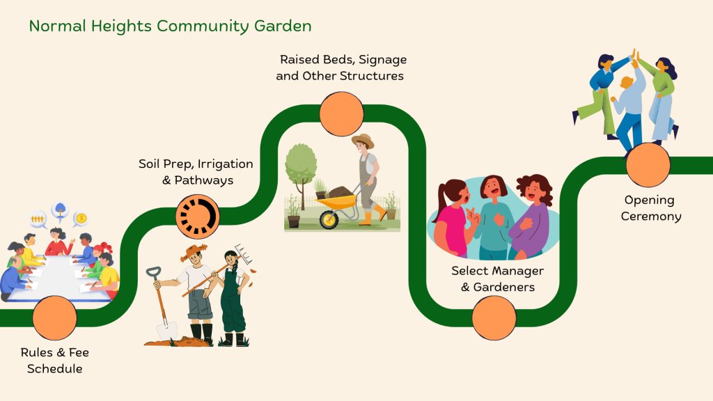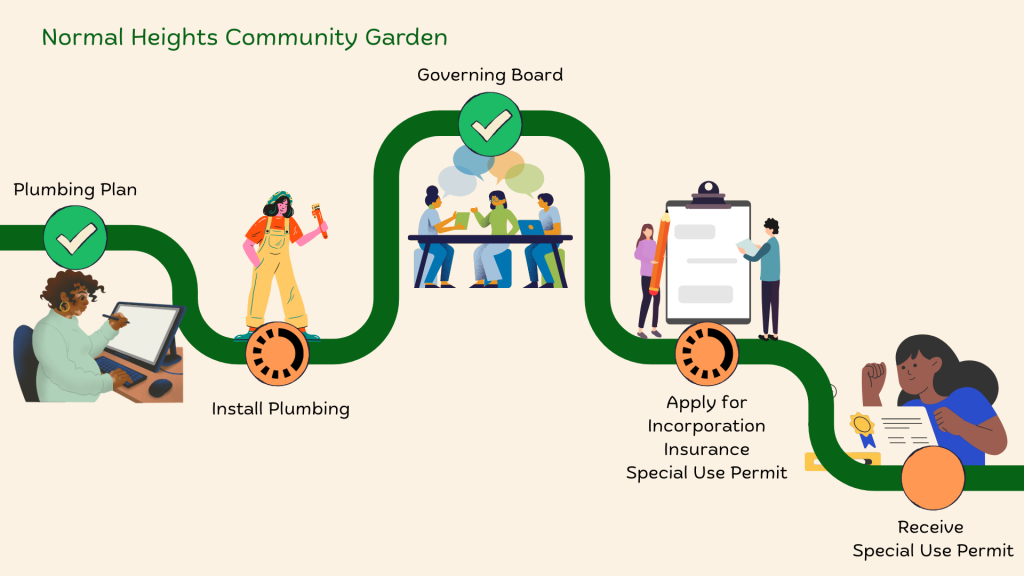 We are working on getting a conditional use permit in place by spring 2026 along with the installation of a water source. Subscribe to the NHCPG newsletter and/or the Normal Heights for Smart Growth newsletter to stay updated.